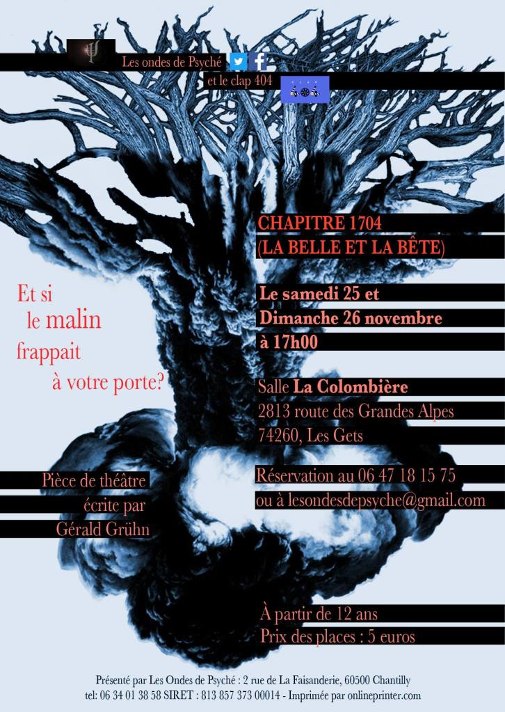 Cette pièce de Gérald Gruhn a représentée au centre Culturel de Chantilly (60) le 11 et le 12 février 2017 et aux Gets (74), le 25 et le 26 novembre.